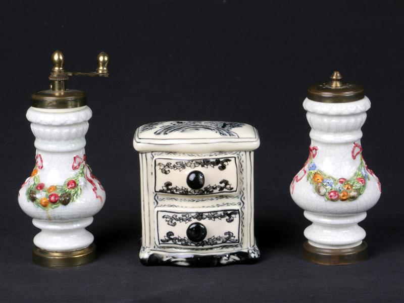 İTALYAN. TUZLUK VE KARABİBERLİK GÖVDE ÜZERİ KABARTMA ÇİÇEK DESELERİ İLE BEZELİ. 13-15 CM.ÇEKMECELİ DOLAP FORMUNDA BAHARATLIK. 9X10X4 CM.