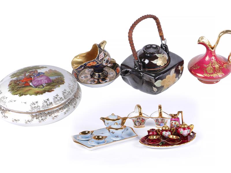 LİMOGES İMALAT DAMGALI KAPAKLI ŞEKERLİK, SOSLUK, SÜTLÜK VE 2 ADET MİNİ ÇAY SETİ. UZAKDOĞU DEMLİK VE FİNCAN
