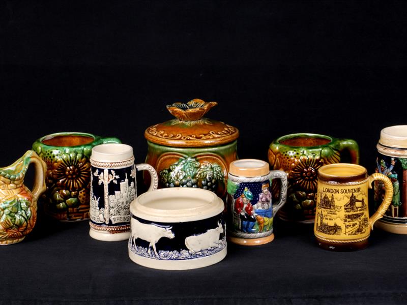 KABARTMA İŞÇİLİKLİ VE MUHTELİF DESENLİ 6 ADET KUPA. 1 ADET KAPAKLI KUTU VE 1 ADET ŞEKERLİK.