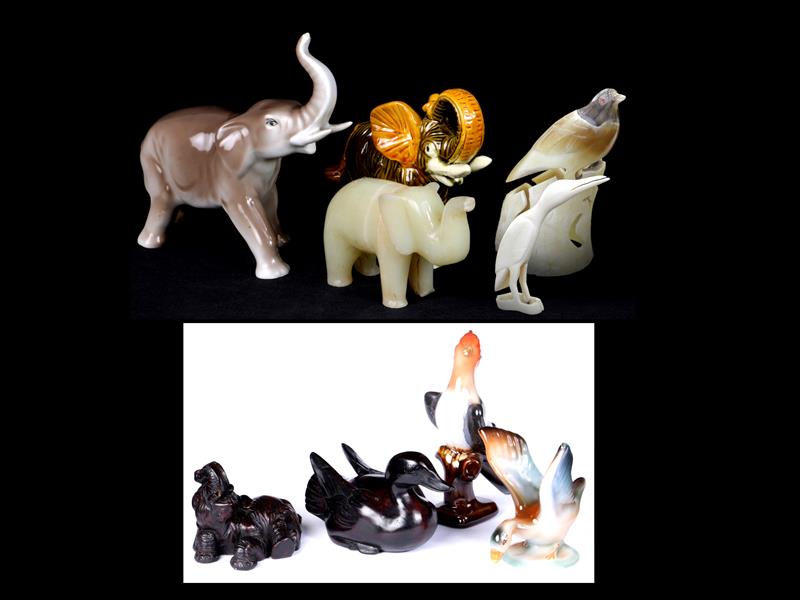 SERAMİK, BOYNUZ, MERMER VE POLYESTERDEN MAMÜL. 4 ADET FİL 5 ADET KUŞ FİGÜRÜ. H 6,5 - 16,5 CM.