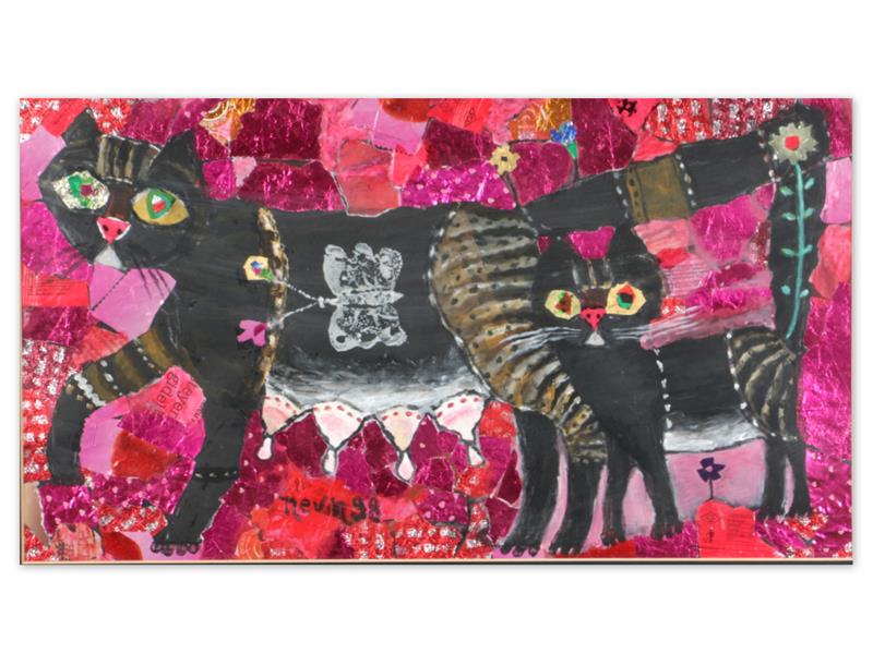 KEDİ. KARTON ÜZERİ KARIŞIK TEKNİK. İMZALI. 1998 T. 28X49 CM.