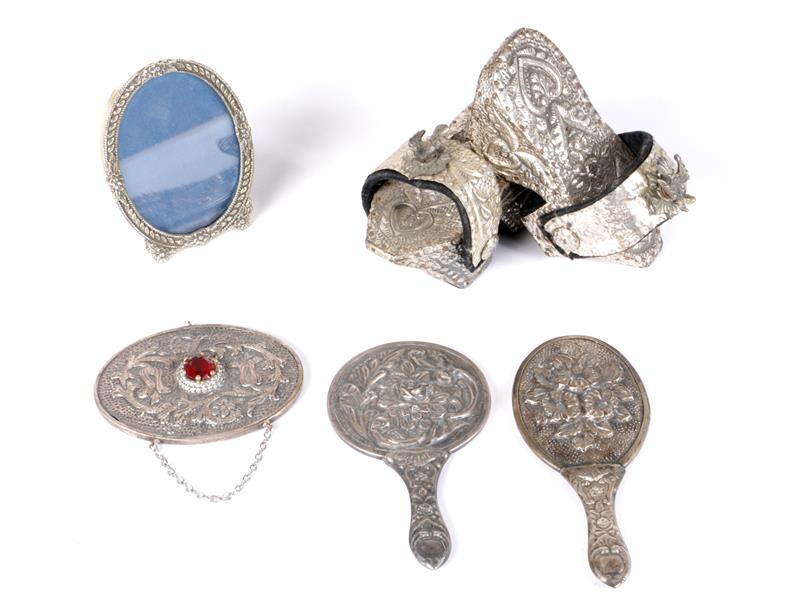 KABARTMA MOTİFLERLE DEKORLU 4 ADET AYNA. UZ 8-11,5 CM. 1 ÇİFT AHŞAP ÜZERİ GÜMÜŞ TAKUNYA. ÜST KISIMLARI GÜVERCİN APLİKELİ. UZ 11 CM.