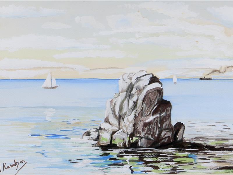 DENİZDE KAYALIK. KARTON ÜZERİ SULUBOYA. İMZALI. 22X31 CM.