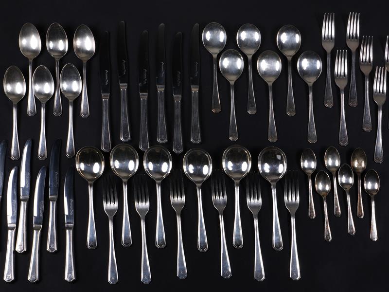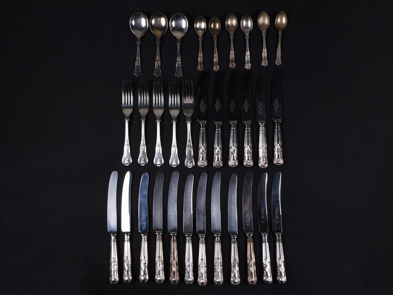 İNGİLİZ. E.P.N.S. İMALAT DAMGALI. 12 ADET BIÇAK, 18 ADET KAŞIK, 6 ADET ÇAY KAŞIĞI, 12 ADET ÇATAL. TAMAMI K İNİSİYALLİ.