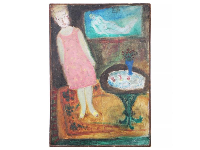 PEMBE ELBİSELİ KIZ. TUAL ÜZERİ YAĞLIBOYA. İNİSİYALLİ. 50X35 CM.