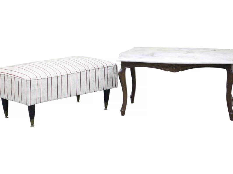 PUF, DİKDÖTGEN FOMLU VE KUMAŞ KAPLI. AHŞAP AYAKLI. 81X46X34 CM. MERMER TABLALI SEHPA. 90X55X43 CM.